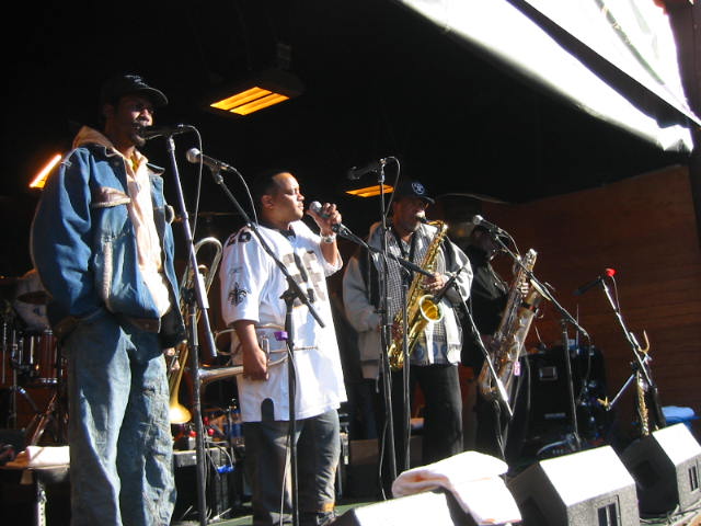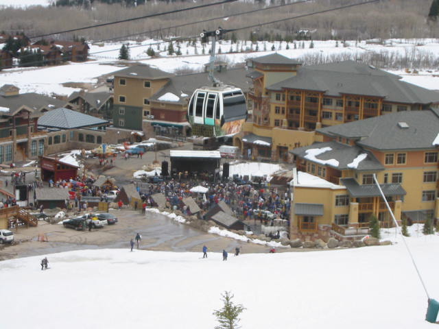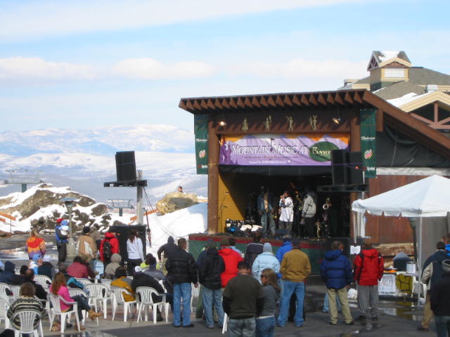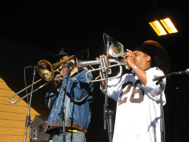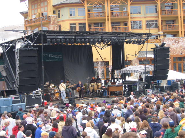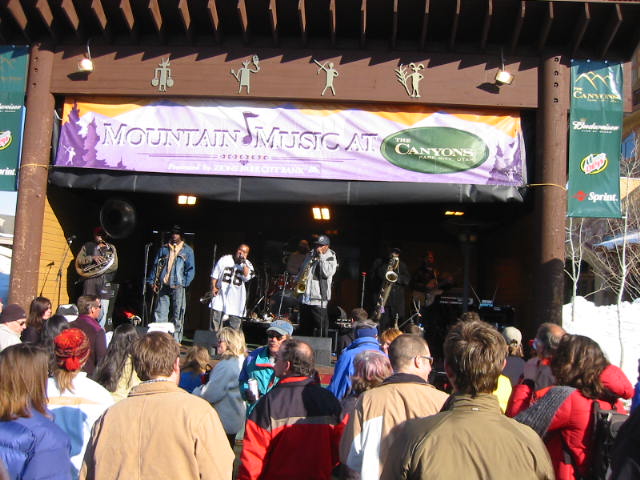 All too often, apres-ski music is some dude in a bar with an acoustic guitar doing Jimmy Buffett and James Taylor cover songs. Not that there's anything wrong with that, but it's not something you would go out of your way for. So a huge kudos to The Canyons ski resort for putting on some real music. Saturdays in the springtime, from 3-5 pm, right at the base of the mountain, for free, they bring in bands you actually want to see. The 2005 season included Papa Mali (who I missed), Sonny Landreth (who rocked), and personal favorite The Dirty Dozen Brass Band, pictured here. Although not technically part of the same festival (different sponsors, I suppose), the next week String Cheese Incident played the same stage, same time. |
