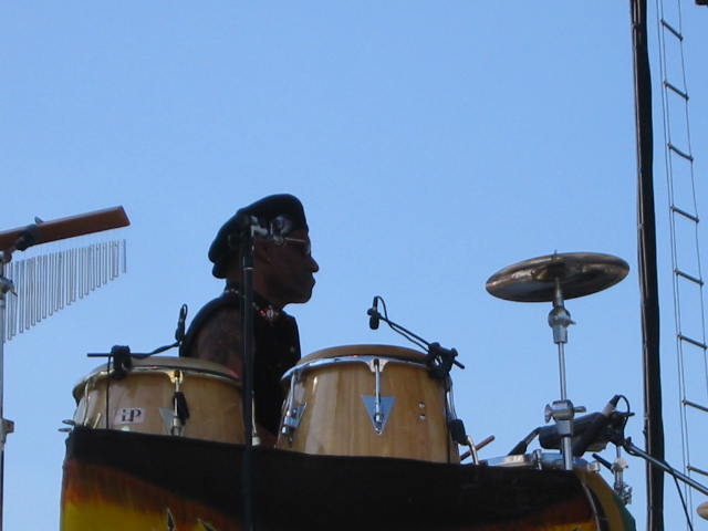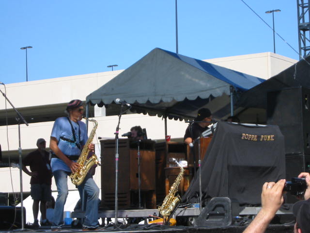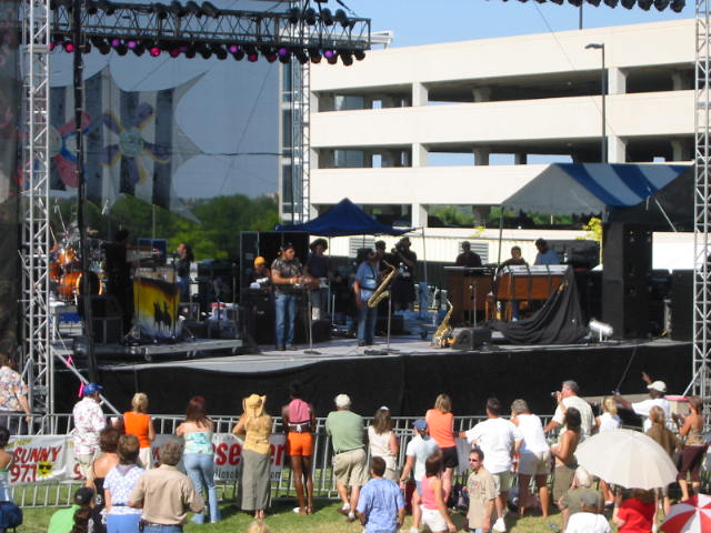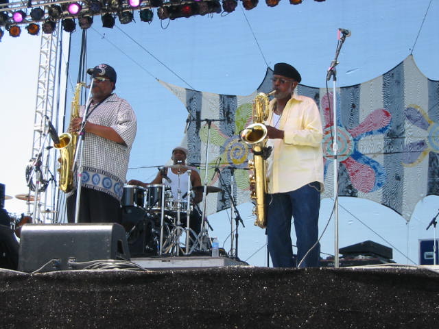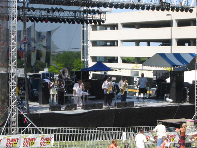 Admission is now up to $15, although a 3 day weekend pass is just $20. The fest was held a few weekends later this year than in the past, and they paid for it, weather-wise, as the mercury pushed the record, climbing into the upper 90's. Consequently, anywhere with shade quickly became the most popular spot, with the air conditioned concert hall lobby the place to cool off. But the bands I came to see were from New Orleans, so this heat was nothing new to them. Less than two months earlier, I'd seen the Dozen play another outdoor Fest in the snow, when it was about 80 degrees cooler. They were as good or better in the heat. The same could not be said for me, as the climate made dancing a challenge. They must have spotted my shirt, but when I heard the subsequent shout-out "Pet De Kat is in Da House", I couldn;t help but think "Pet De Kat is in Da Shade". The Nevilles also excelled, striking a nice balance between Aaron's gospel, the softer R&B sound, and the funk that gave Art is nickname, Poppa Funk. Highlights were Iko Iko, Big Chief, and a killer Yellow Moon. |